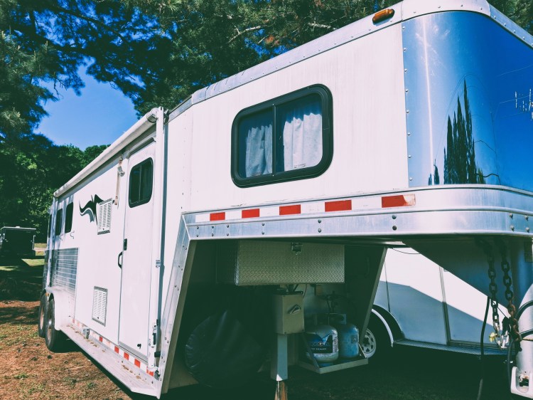 Bathroom: Shower, toilet, storage, and a door into the horse compartment.