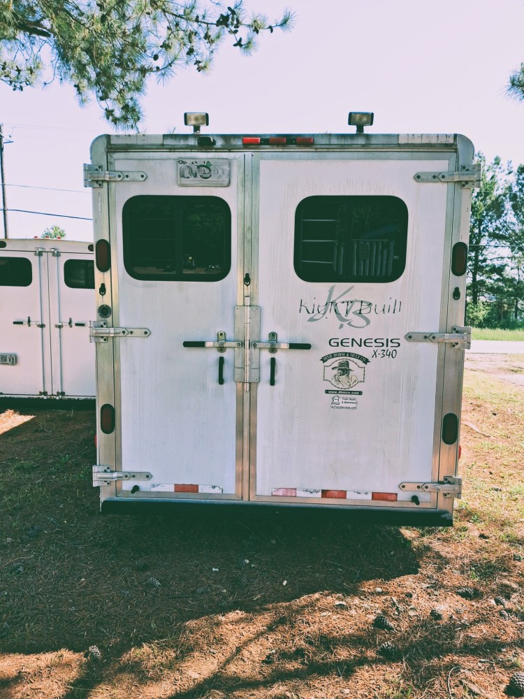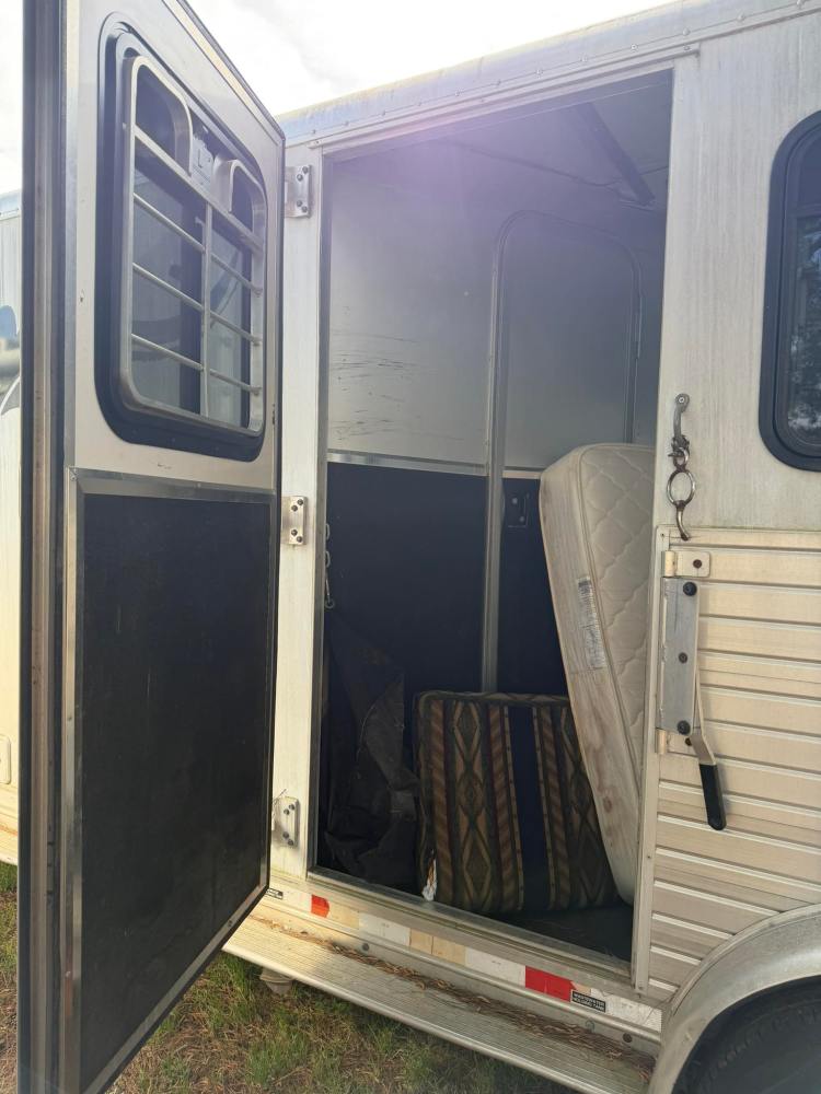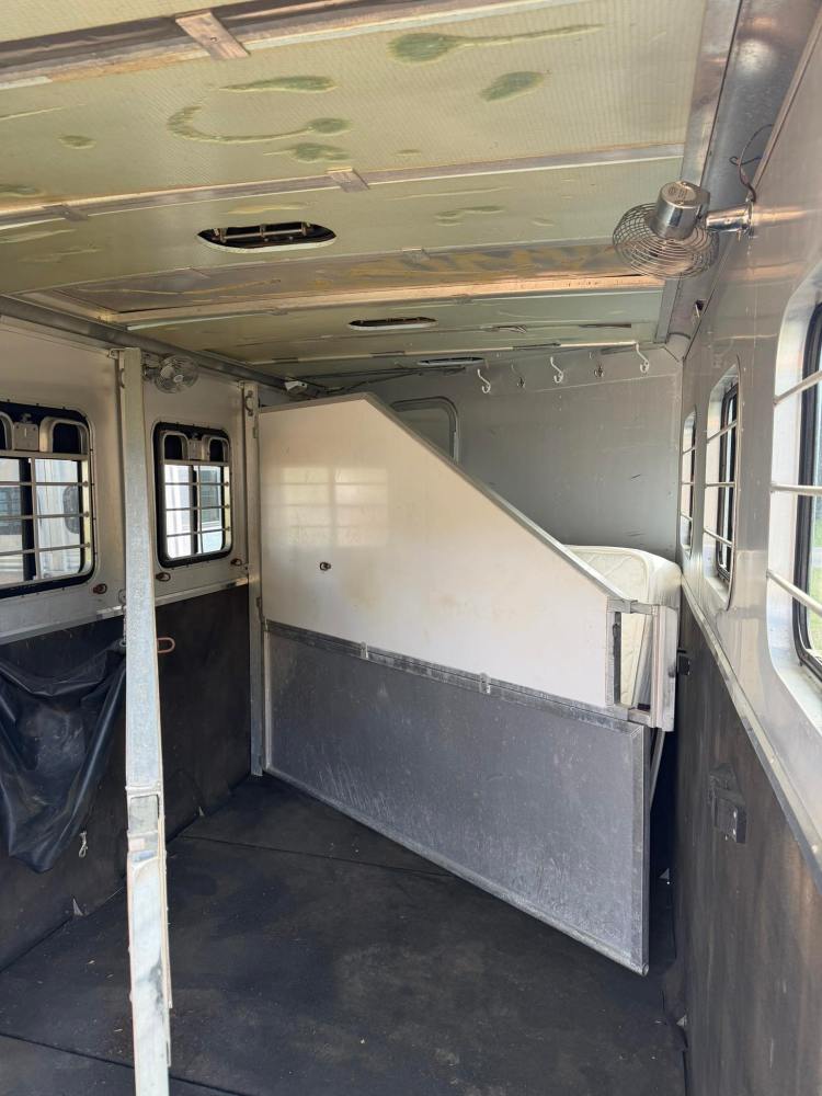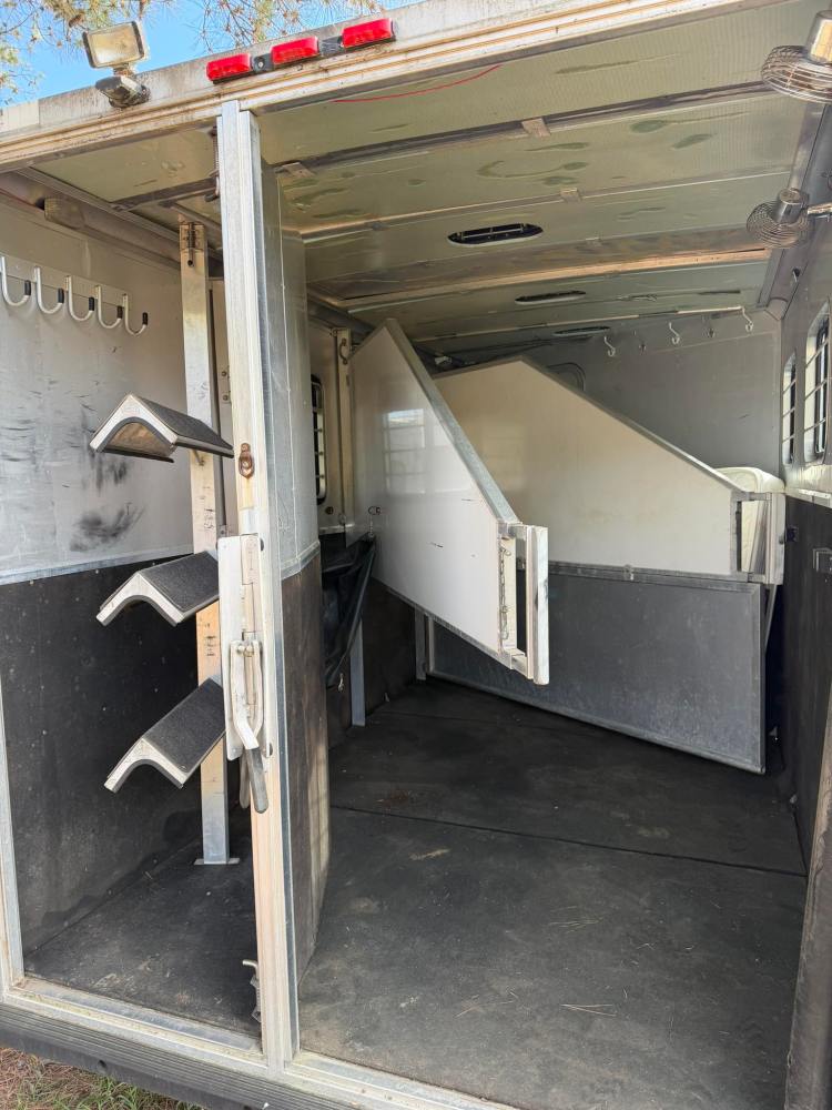 Horse Compartment: Three-horse slant load with a ramp, vents, fans, padded butt bars, and bridle hooks. Includes an access door to the bathroom.