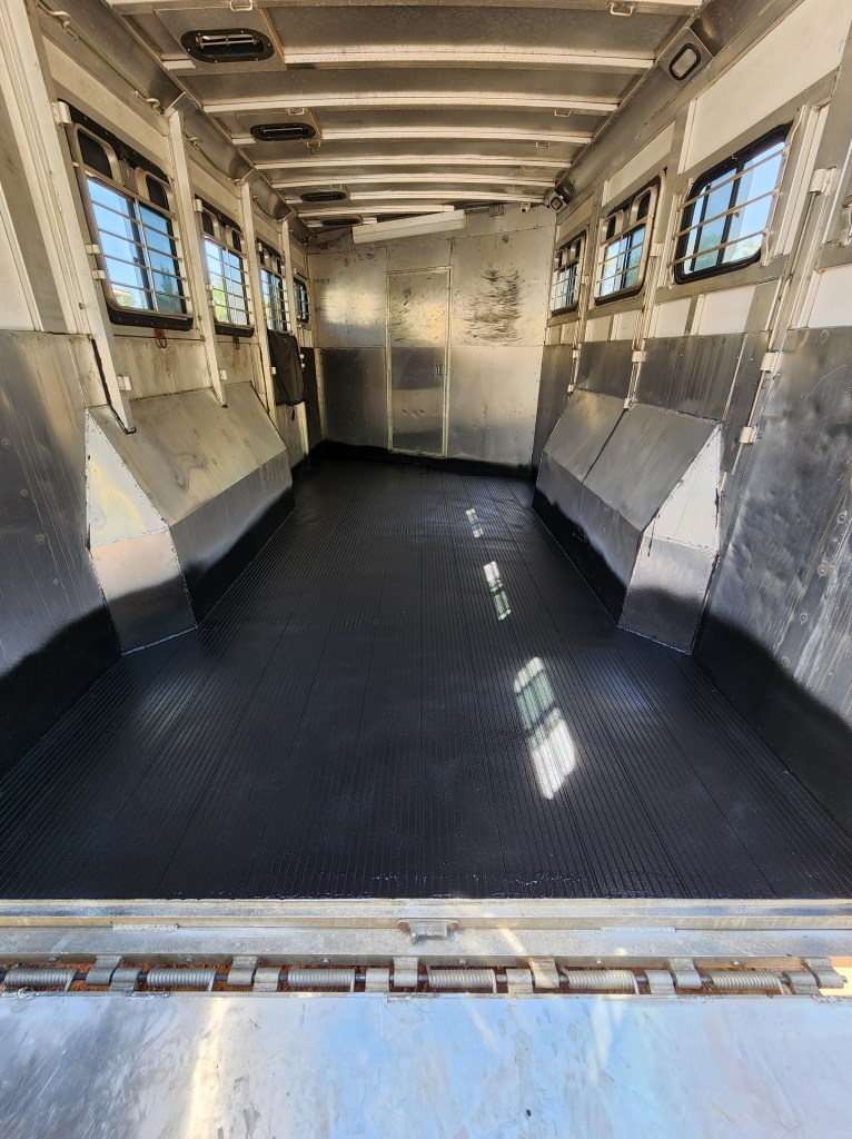 Take a look at this gorgeous trailer floor. In this picture the wall and floor mats have been removed. We spray up the sides of the walls to prevent build up reaching bare aluminum. After the liner dried, we installed the wall mats and put the floor mats back in. This liner is designed to be used under floor mats.